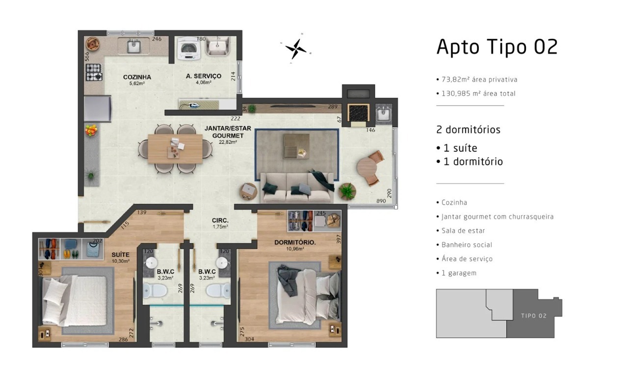 2 Dormitórios, sendo 1 Suíte1 Banheiro1 Vaga