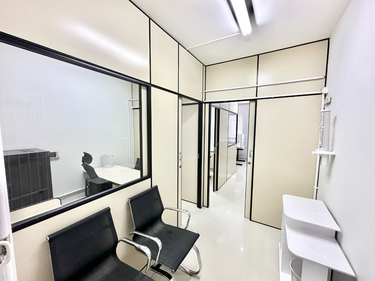 Sala já com divisorias, móveis e cadeiras de escritório, frigobar, microondas e ar condicionado, conta também com copa e lavabo.
