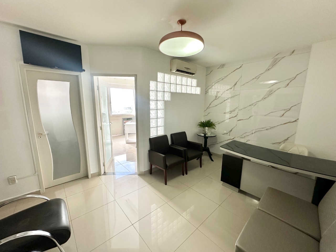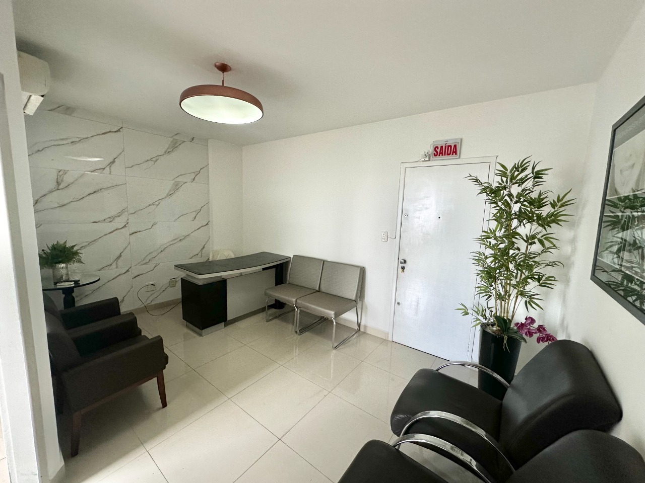 Duas salas comerciais com 32,5m² de área privativa cada, contendo 01 recepção, 02 banheiros, 01 copa, 01 sala de esterilização e 03 consultórios.